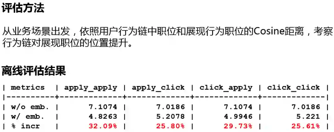 图中表格显示了用户历史行为链对展现职位的位置提升,如在没有使用Embedding时,历史行为链投递的职位与展现列表中产生投递行为的职位计算Cosine距离重排序后,平均位置为7.1074,使用Embedding后平均位置为4.8236,得到了32.09%的提升,类似的,历史行为链中的点击行为与展现列表中产生投递行为的职位计算Cosine距离重排序,显示对展现职位的位置得到了29.73%的提升。