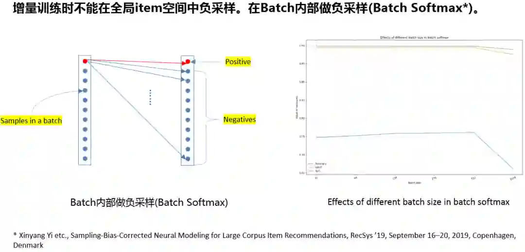 实时召回时要对模型进行在线的增量更新,无法使用离线时的负采样操作;我们参考了Youtube团队19年提出的batch softmax方法,在batch内进行负采样,具体细节请参考论文[1]。