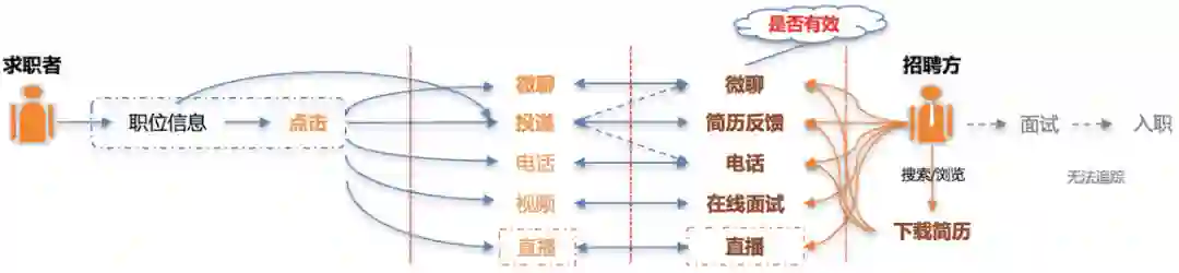 求职者进入App后,会在展现的职位信息中产生行为,如直接投递简历,或者点击进入职位详情页后通过简历投递、IM、电话等多种方式与招聘方交互;