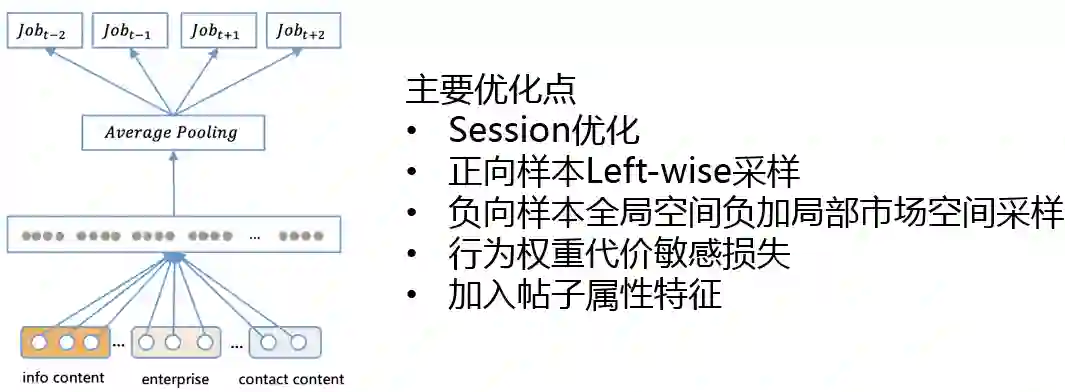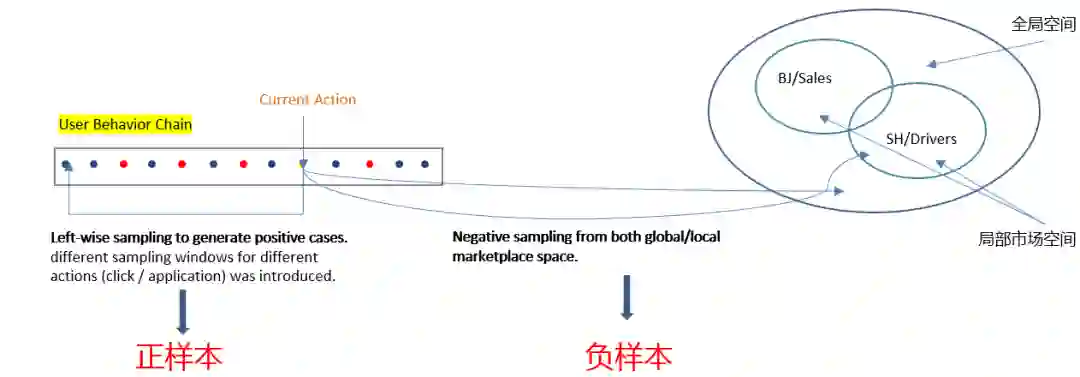 负向样本同时在全局空间和局部市场空间采样,当前用户行为的招聘帖具有位置和种类等属性,可以在同位置、同种类的局部市场空间采样
