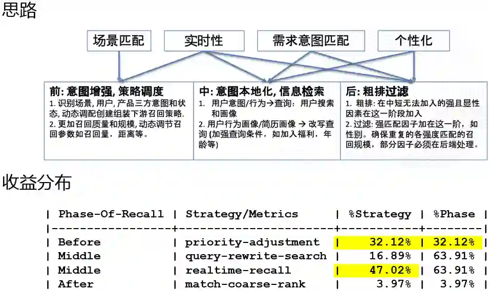 召回前的优化得到了约32%的收益提升,召回中的优化得到了约64%的收益提升,召回后的优化只得到了约4%的收益提升,召回后阶段还有很大的优化空间。