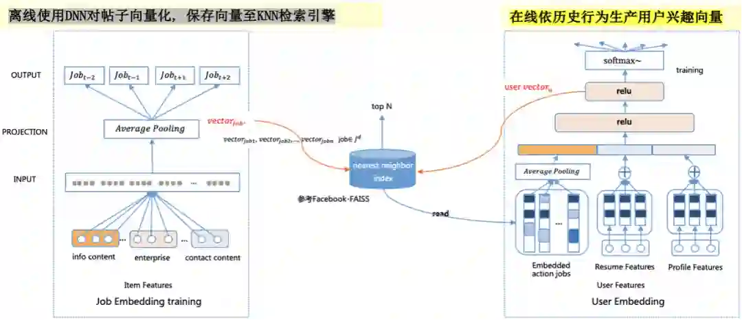使用双塔架构进行实时召回在业界得到了极为广泛的使用,Facebook、微软、百度等公司都针对自身业务提出了各自的双塔网络架构。58招聘则参考了Youtube技术团队19年提出的双塔架构[1]。
