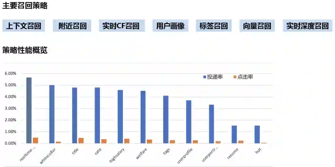 58招聘推荐系统的召回策略多达十几种。主要有:上下文召回、附近召回、实时CF召回、用户画像、标签召回、向量召回、实时深度召回。