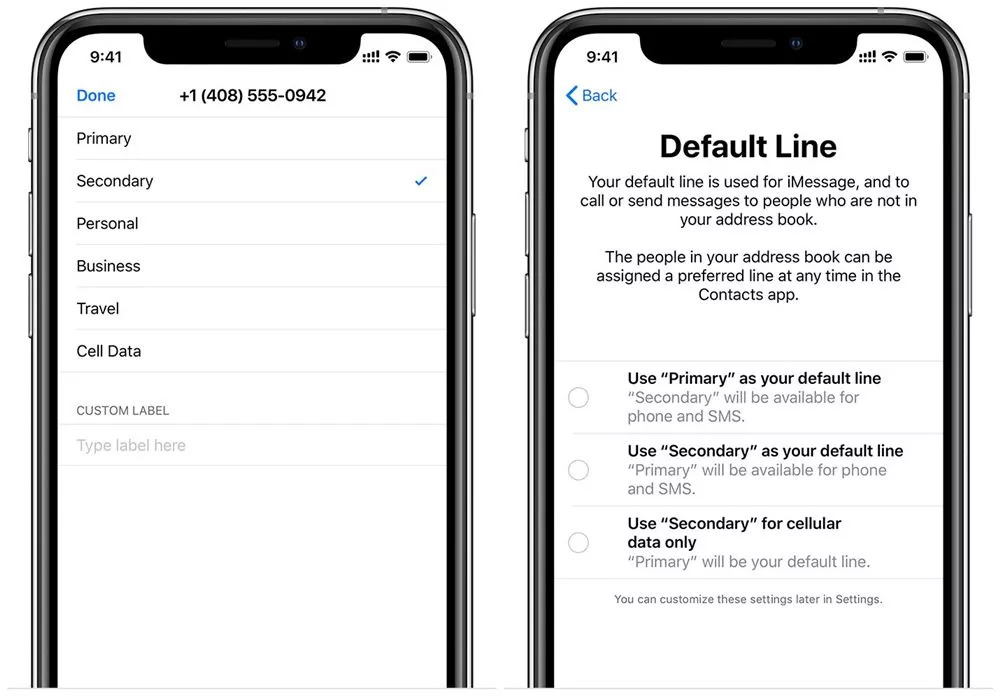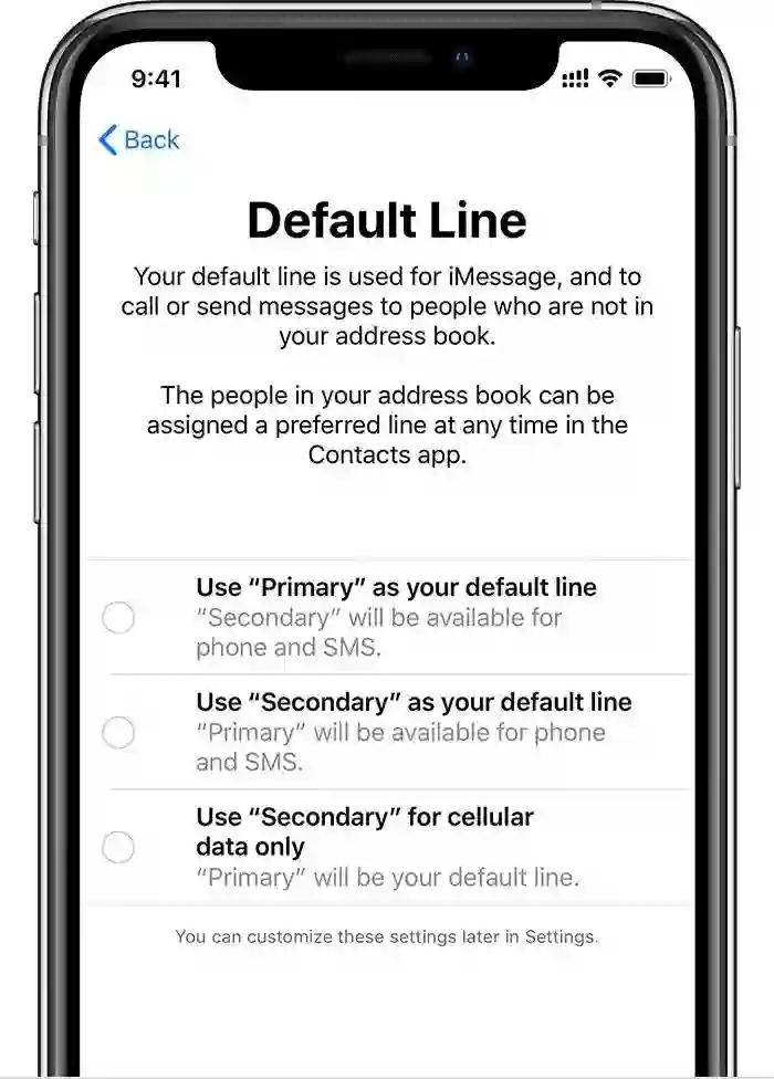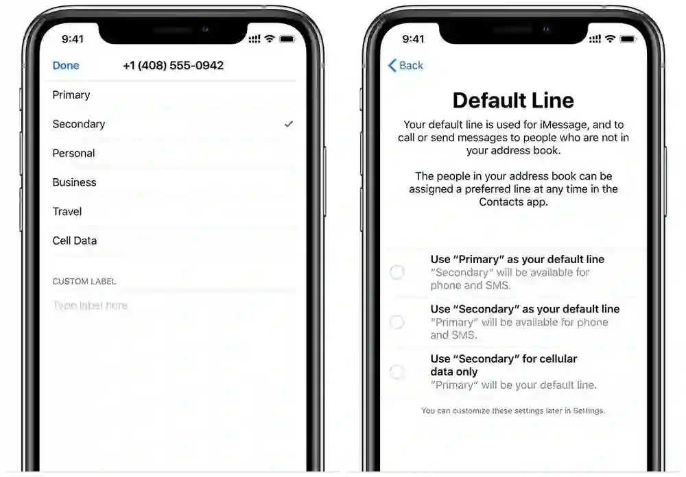 1. 将“主号”用作默认号码:“主号”会被用作语音、短信、数据、iMessage 信息和 FaceTime 通话的默认号码。“副号”只能用于语音和短信。