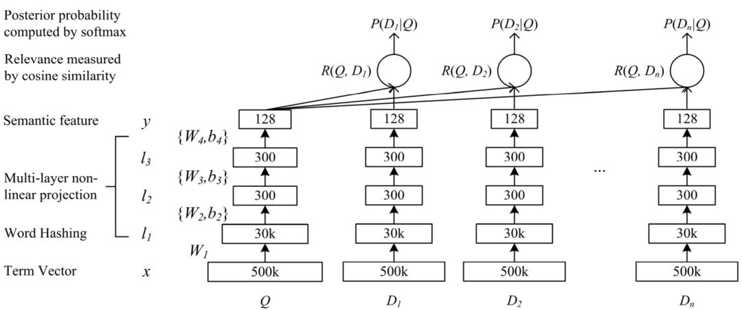 ,可通过得到的余弦相似度来进行匹配度排序。DSSM 的结构如下图所示: