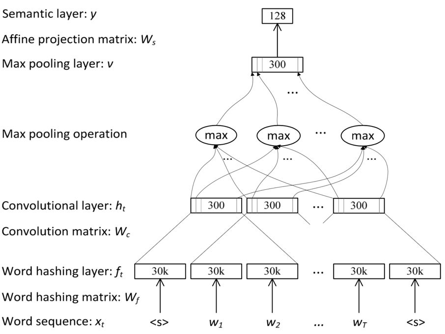 同第一部分所描述的 CNN 作用原理,卷积层会考虑每一个上下文窗口中的词哈希向量,再将此向量映射为较低维的局部上下文向量。对于一系列相关的局部上下文向量,最大池化层可以过滤掉不重要的文本特征,只保留最显著的,形成全局上下文向量。进而在 DSSM 的基础上,更进一步的考虑并联系了上下文的语义特征,达到更好的文本匹配效果。