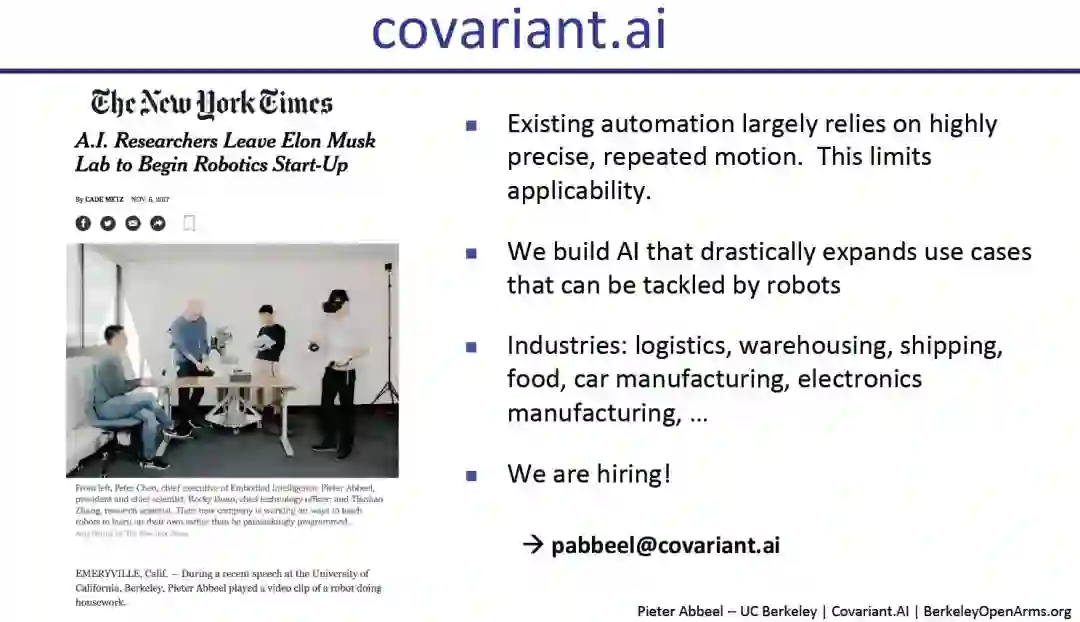 Pieter Abbeel,加州大学伯克利分校教授、机器人学习实验室主任,伯克利人工智能研究(BAIR)实验室联合主任。Pieter Abbeel是机器人和强化学习领域的大牛。Pieter Abbeel 2008年从斯坦福大学获得博士学位,师从百度前首席科学家 Andrew Ng(吴恩达),毕业后在UC Berkeley任教。Pieter Abbeel还是两家AI公司的创始人,Gradescope和covariant.ai。Gradescope开发为家庭作业、课题研究、试卷等打分的AI系统;covariant.ai开发机器人自动化的AI系统,在制造/仓储/电子商务/物流等领域应用。