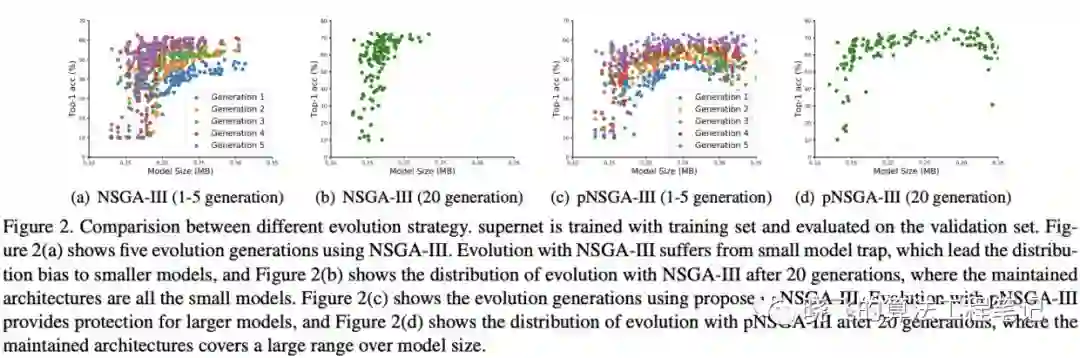假设优化目标为模型参数和准确率,对于NSGA-III,会根据两个不同的指标进行non-dominated排序,然后根据帕累托图进行选择。而对于pNSGA-III,额外添加考虑准确率的增长速度的non-dominated排序,最后结合两种排序进行选择。这样,准确率增长较慢的大模型也能得到保留。如图2所示,pNSGA-III很明显保留的模型大小更广,且准确率与NSGA-III相当