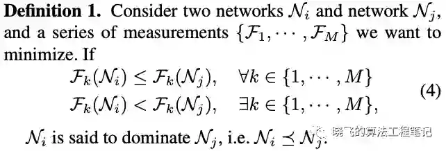 对于结构的优化过程,使用NSGA-III算法的non-dominated排序策略进行。标记 为 个不同的网络, 为希望优化的 个指标,一般这些指标都是有冲突的,例如参数量、浮点运算量、推理时延和准确率,导致同时优化这些指标会比较难