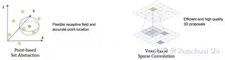 这两种方式各有各的优点:(1) SA在原始点云上做,保留了准确的位置信息,且通过自定义球的半径使得感受野更为灵活。(2) Sparse conv在voxel上做,速度往往更快,并且在自动驾驶场景下结合anchor可以产生更高质量的3D Proposal (室内场景一般来讲通过PointRCNN[3]中提出的anchor-free策略提Proposal更为高效且直观)。