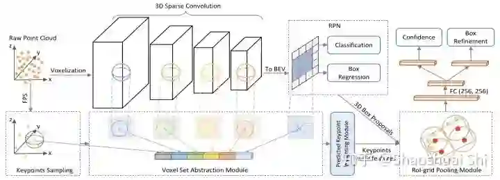 因此,我们接着考虑,怎么能将整个场景编码到少量的keypoint上,用这些point-wise的keypoint特征来做第二阶段的RoIPooling,也就是将其作为桥梁,来连接检测框架的两个阶段。