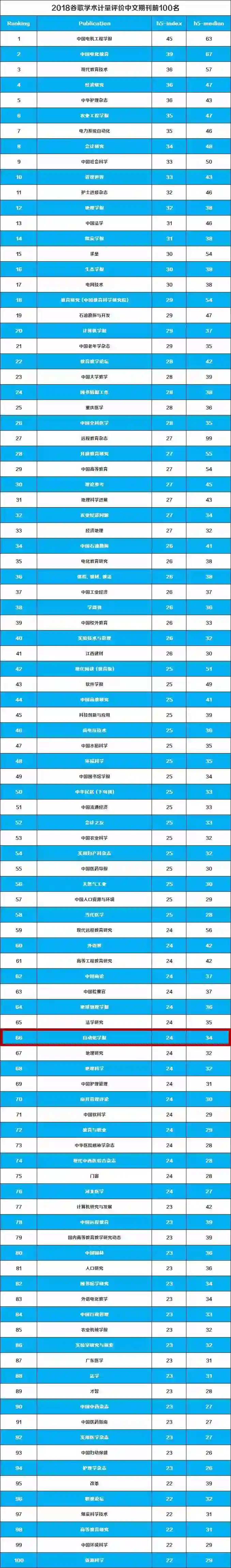 近期,谷歌学术(Google Scholar)公布了2018年最新的学术期刊/会议影响力排名,自动化所主办的学术期刊《自动化学报》进入中文期刊TOP100,排名位于第66位。