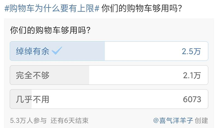 其中有人发起一个投票,你的购物车够用吗,有5.3万人参与投票,其中绰绰有余的2.5万人,而表示购物车完全不够的也有2.1万人,说明这个痛点还是有较大一部分用户群体存在痛点的。