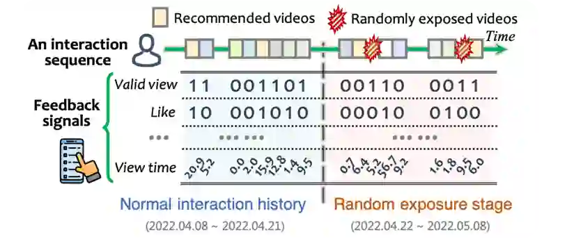 而KuaiRand数据集,是这样视频序列推荐场景中第一个插入了随机视频的数据集。下图展现了某个用户的一个视频推荐流。时间跨度从2022年4月08日到2022年5月8日。四周的数据被分为两部分,前两周的数据均是正常推荐的视频,而后两周的数据则在正常推荐流中的任意位置以小概率插入了随机的视频。本次发布的数据集忠实地公布了15个推荐场景(不同页面)中用户对所有推荐视频的12种反馈。