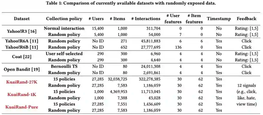 目前主流使用的具有随机曝光商品的推荐数据集是Coat和Yahoo!R3, 最近又有一个发布的Open Bandit数据集。然而,它们要么缺乏显式的用户id(仅以特征向量表示每个用户),要么信息量过于小(如Coat仅包含上百个用户和商品,Yahoo!R3没有额外特征)。在所有维度上,KuaiRand数据集都具有碾压级优势。