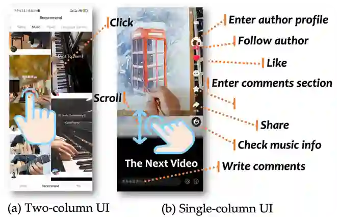 如今短视频成为人们熟知的内容载体。上图展现了快手的视频推荐界面,左边是双列界面,需点击特定视频才能播放;右边是单列的界面,默认自动播放,上下滑可切换到下一个视频。页面上有大量的交互按钮,如“喜欢”、“转发”、“分享”等,均可作为用户对推荐视频的反馈信号。