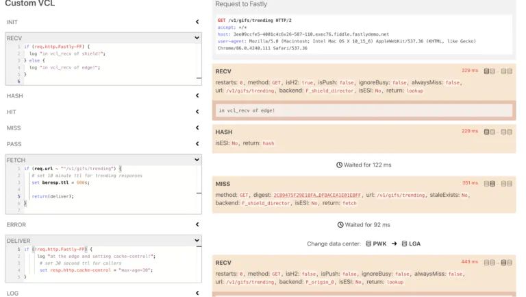 所幸的是,Fastly Fiddle 工具在执行 VCL 代码时能得到更好的信息。在这个工具中,我们可以模拟各种 VCL 代码部分,并了解 Fastly 的边缘以及 Origin Shield 服务器将如何处理 VCL 代码的信息。