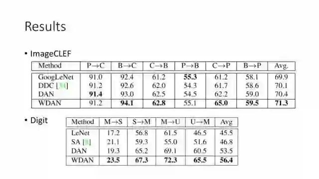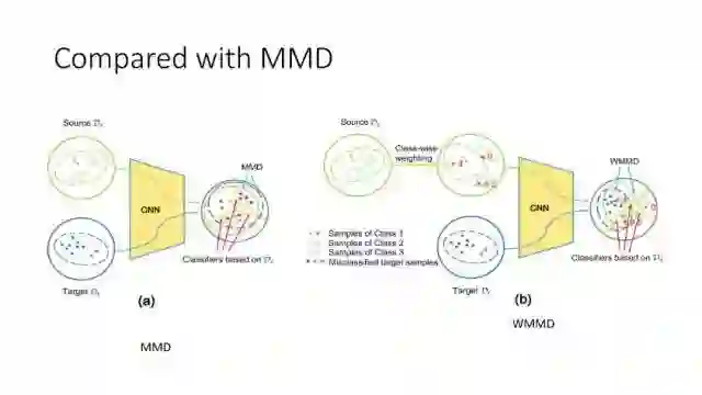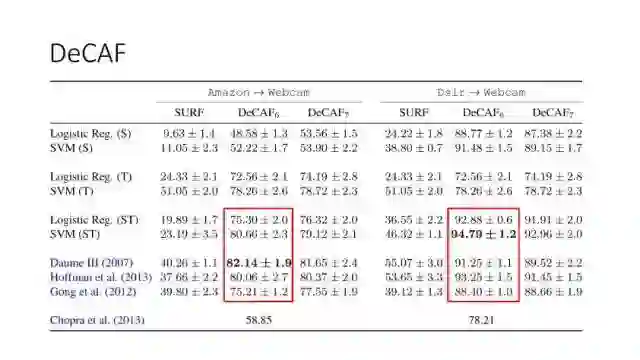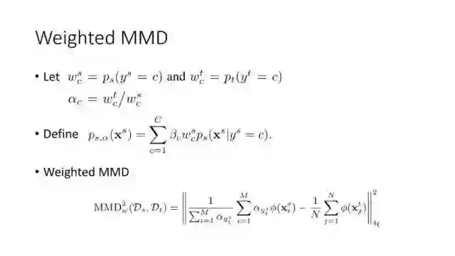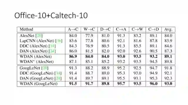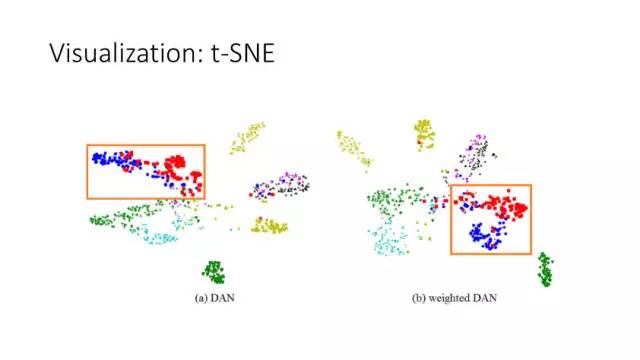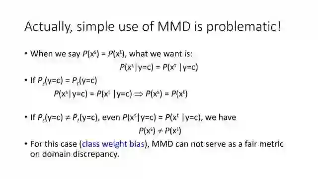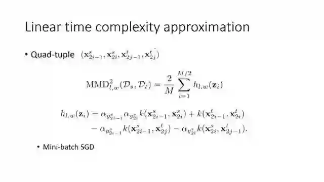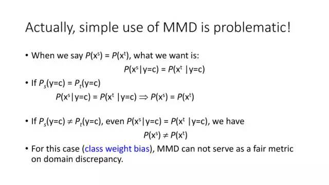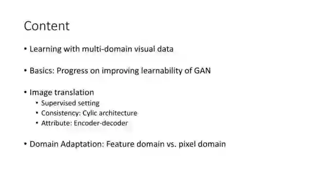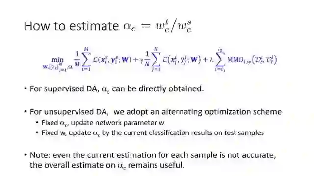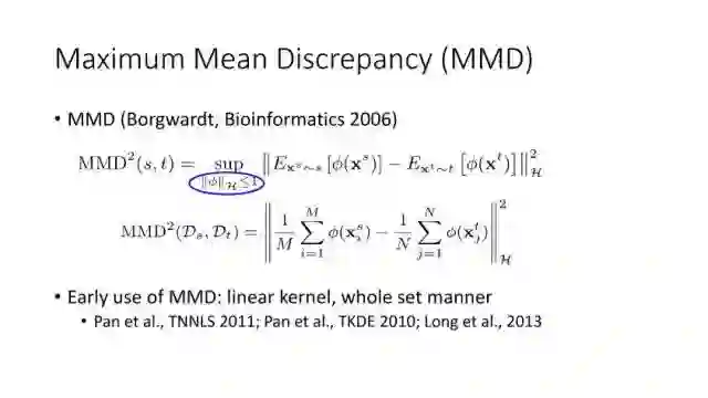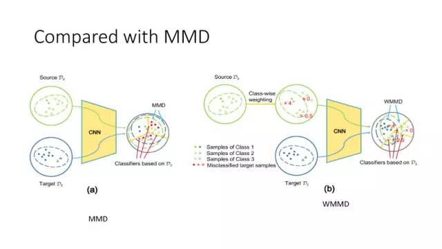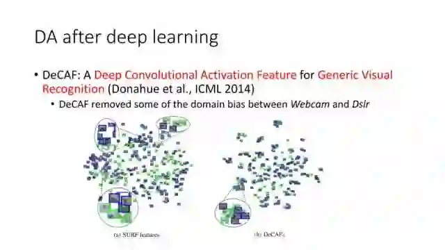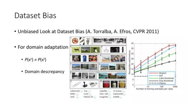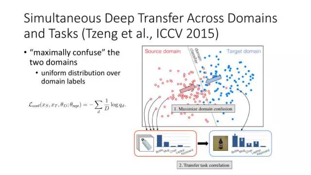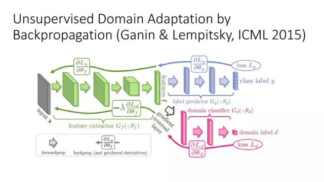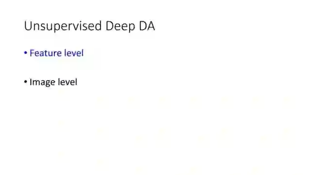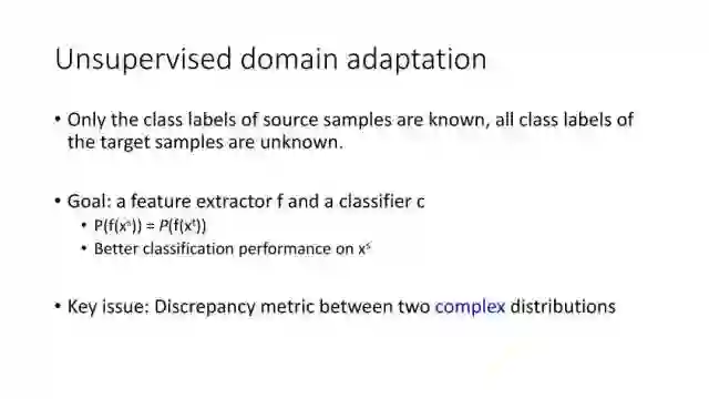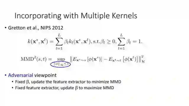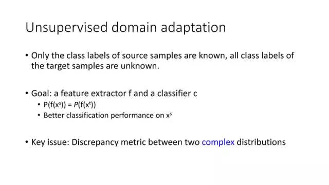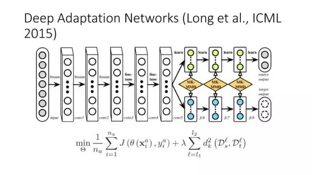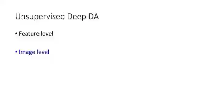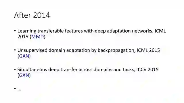 下面讲讲Deep Domain Adaptation。在GAN出来之前,该领域已经做了十来年了。传统Domain Adaptation目标主要是指在领域A学得的模型,用于领域B。为了实现这个目标,我们设定了任务。第一个任务就是有监督的这个类型,在这种情况下就是说A里头也有label,B领域里面也有。还有一种就是半监督,即A里面有label,而B领域里面没有或者只有少量label。最后一个就是无监督的领域适应,领域A和B都没有任何标签信息。无监督是最难也是最有意义的。后来随着deep learning的巨大成功,被逐步引入domain adaptation, Donahue等人在ICML2014提出一些有监督是深度特征可以减小不同domain之间的bias。后来(Yosinski et al., NIPS 2014)提出深度特征不能解决domain adaptation问题,从双向的角度出发,domain adaptation是需要的。最开始利用Maximum Mean Discrepancy (MMD) 来实现,主要用线性核,后来将CNN引入实现非线性映射。后来(Gretton et al., NIPS 2012)提出用多核方法实现domain adaptation,从对抗思想来理解,先固定核函数参数,更新特征提取模型的参数来最小化MMD,然后固定特征提取模型参数,更新核函数参数来最大化MMD。