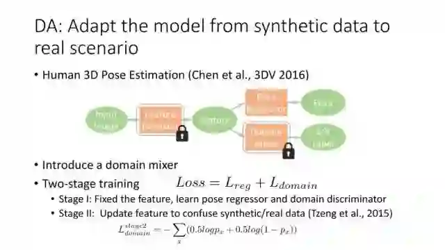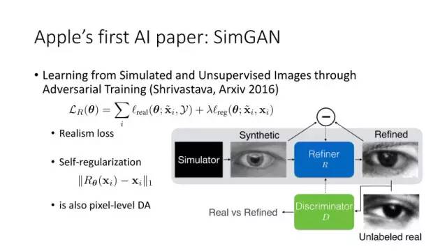 通过2014年的讨论,大家开始从无监督方向考虑,并结合GAN来做研究。时间是无监督DA就是利用合成数据学得模型再利用到真实环境中去,Render for CNN (Su et al., ICCV 2015)就是这样一个工作,如下图所示,他们提出在虚拟仿真图像训练模型,用于实际中估计物体姿态。上述从特征方面来实现domain adaptation,还有一个方面是从图像像素级方面来考虑实现,比较典型的一个工作就是Apple的第一篇AI论文,发表于几年的CVPR上。他们提出SimGAN,这里的输入为仿真图像,利用对抗网络学习来得到一个Refiner网络,从而使得生成图像既有仿真图像的标签数据,又有真实图像的纹理外观信息。