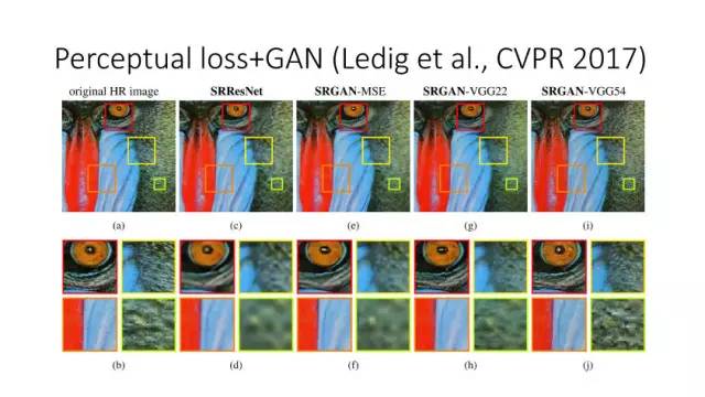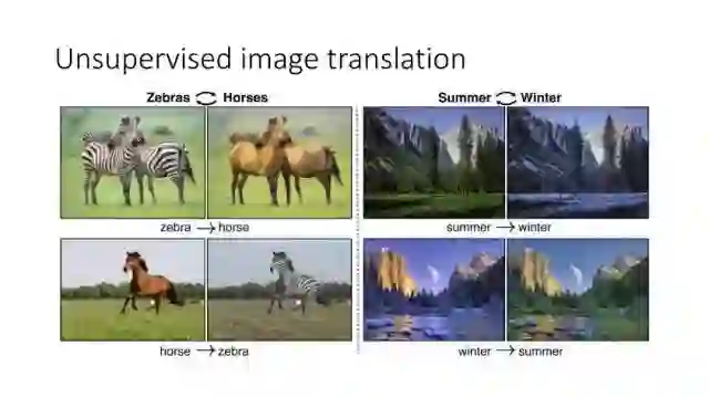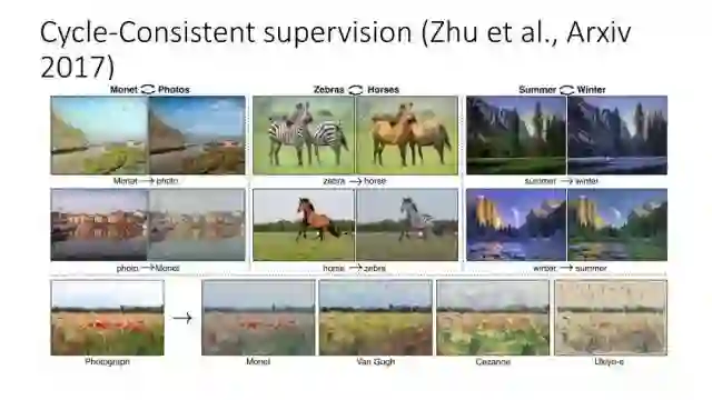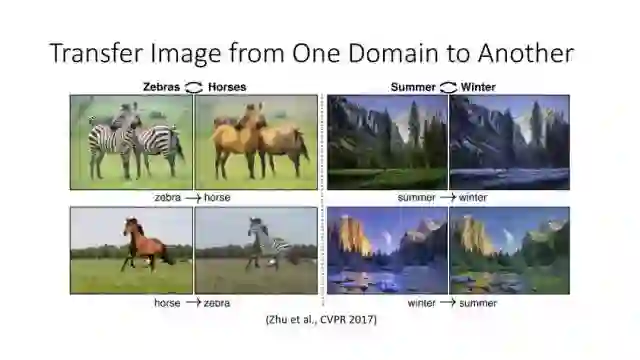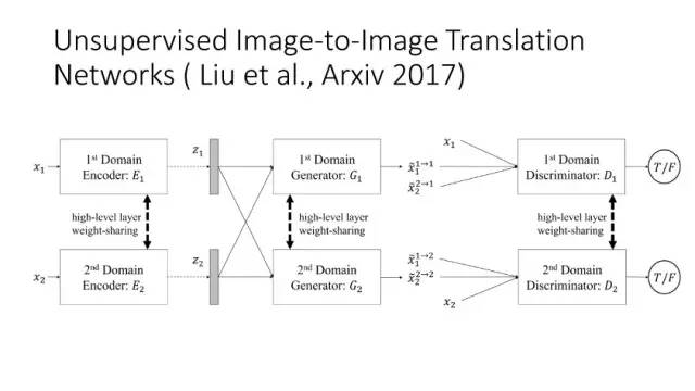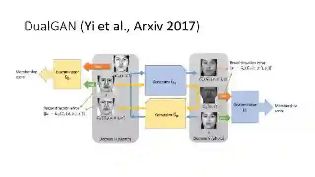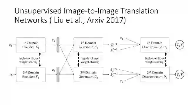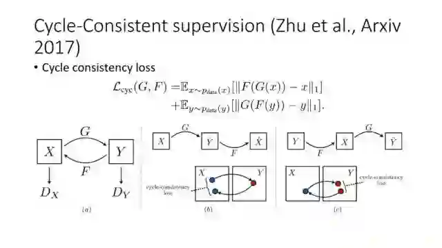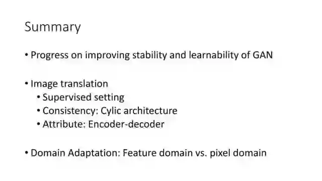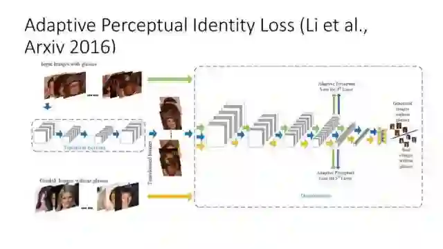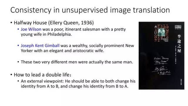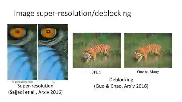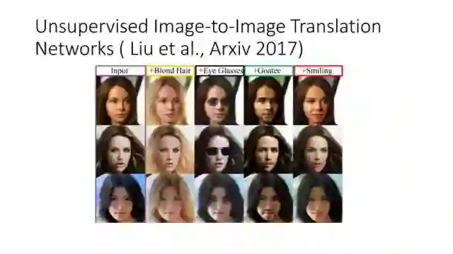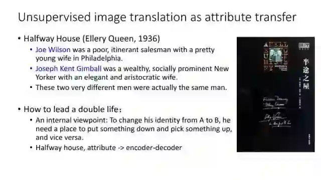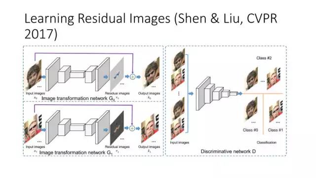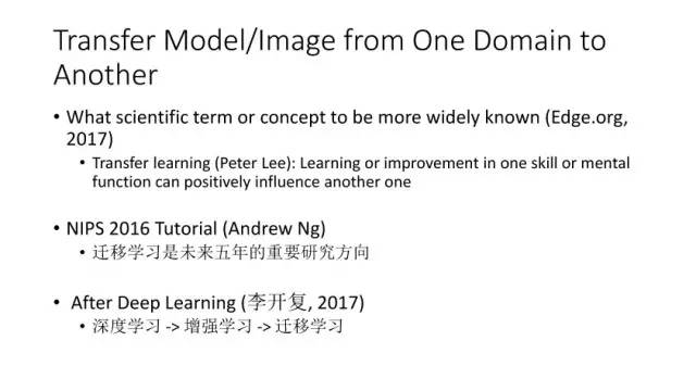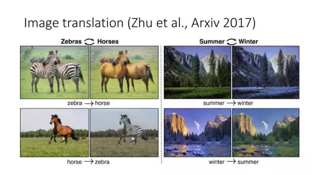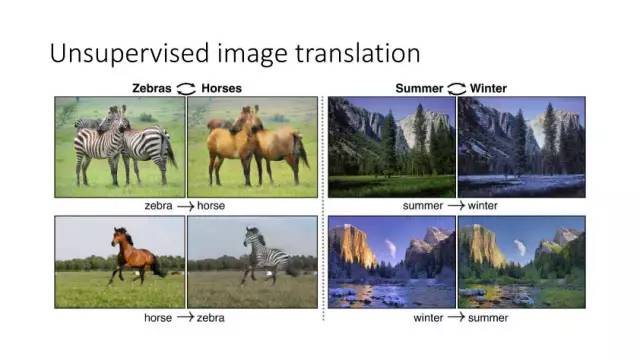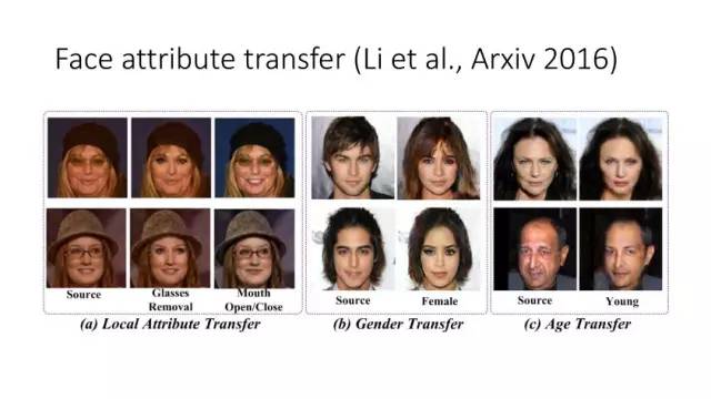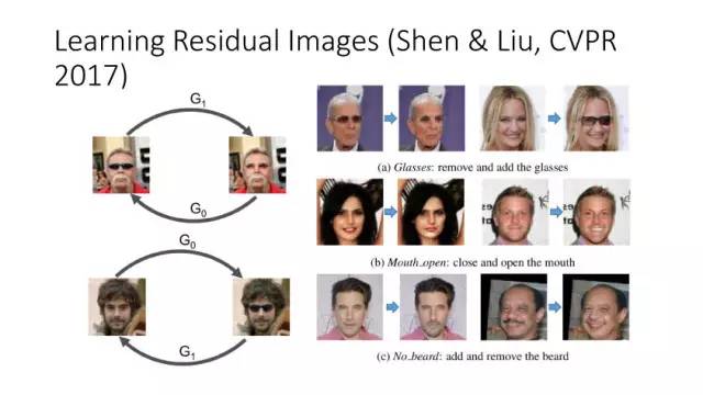 另一种就是无监督图像转换,比如马到斑马的转换,四季场景变化等。还有一个例子就是人脸标签转换,比如性别、是否戴眼镜等。一个典型工作是今年CVPR上的Learning Residual Images(Shen &Liu),他们提出利用一个残差网络来学一个脸部标签(戴眼镜),同时利用另外一个残差网络来去掉眼镜,训练过程中这两个网络一起学习,使得它可以从戴眼镜到不戴眼镜,同时也可以实现从不戴眼镜到戴眼镜,这就相当于一个环,可以实现遍历,最终实现一个可以完成Face attribute transfer的模型。后面还有相似的工作比如DualGAN (Yi et al., Arxiv 2017)和Cycle-Consistent supervision (Zhu et al., Arxiv2017)等。
