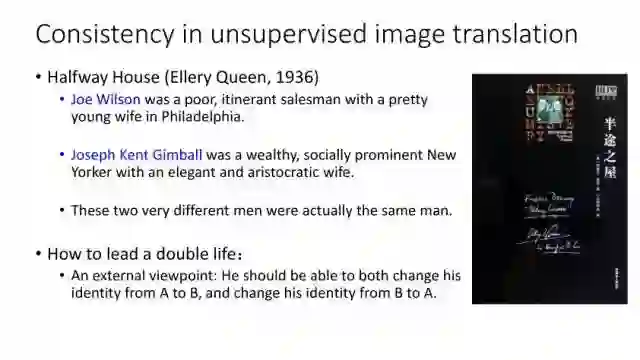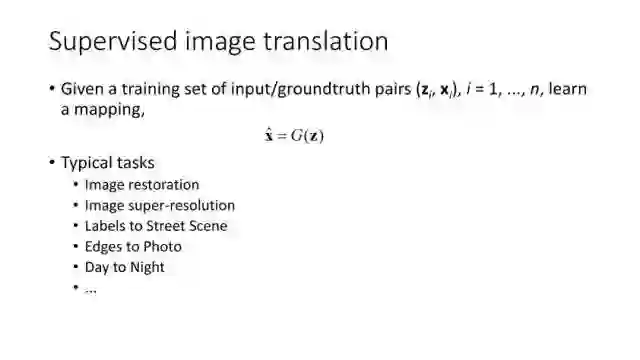 Image Translation可以分为有监督和无监督两种方式。首先就是有监督,最开始的时候是MSE和Perceptual loss,后来有了GAN,更多的工作开始基于GAN来实现。Conditional GAN的视觉效果较好,但仍然有一点局限性,我们还可以基于内部和外部的约束去优化模型结构。有监督的Image Translation主要是图像复原,图像超分辨率,街景分割,边缘检测等。