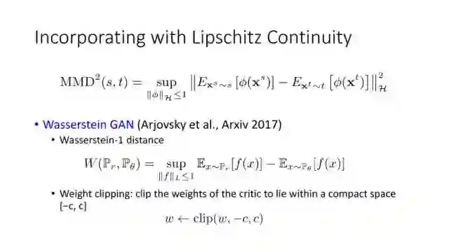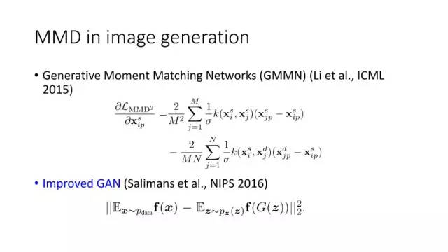 GAN的目的是利用生成网络按照真实数据的分布来生成逼真数据,对于GAN的学习,它是一个最大-最小优化问题。我们先从最大化均方分布(Maximum Mean Discrepancy, MMD)来开始讨论优化改进GAN的学习能力, Borgwardt在06年提出MMD,就是如果假设有两个分布,如果这两个分布相同,那么这两个分布的均值一定相同。但是如果这两个分布的数学期望相同,并不表示两个分布相同。倘若我们将所有分布限制在希尔伯特空间,且小于等于1,此时如果其数学期望相同,那么可以证明这两个分布是相同的。