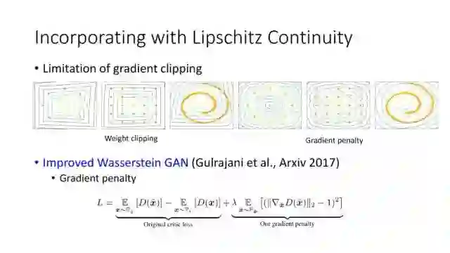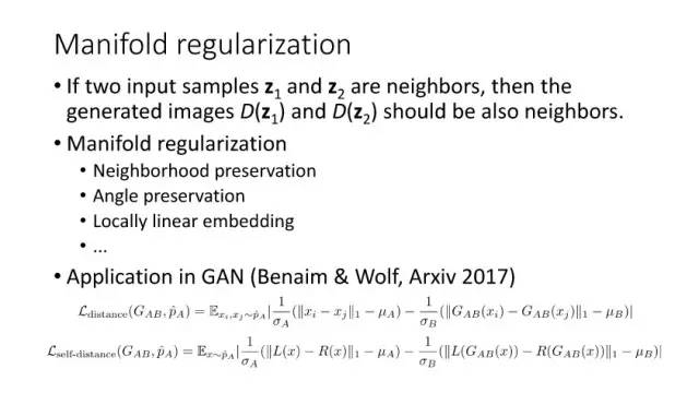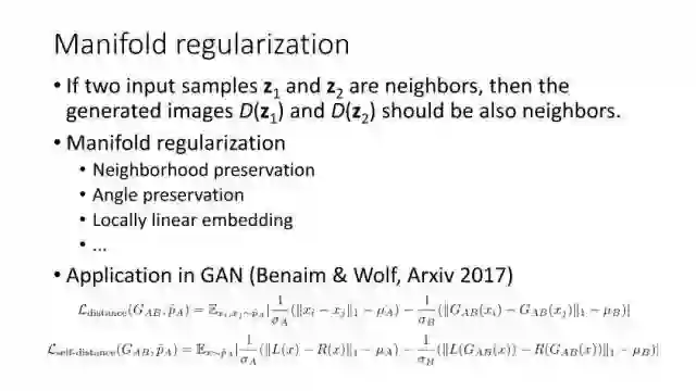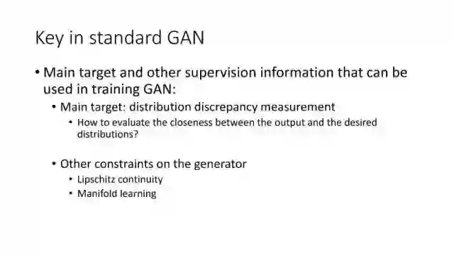后面15年Li等人提出Generative Moment Matching Networks (GMMN)来利用核方法优化求解问题。Salimans等在2016年提出改进的GAN,将问题限制在Lipschitz连续性上,从而解决梯度消失的问题。Arjovsky等人提出Wasserstein GAN,利用Wasserstein距离来度量。另外一个优化方向可以从流行学习角度出发,从而考虑两个分布之间的局部关系。