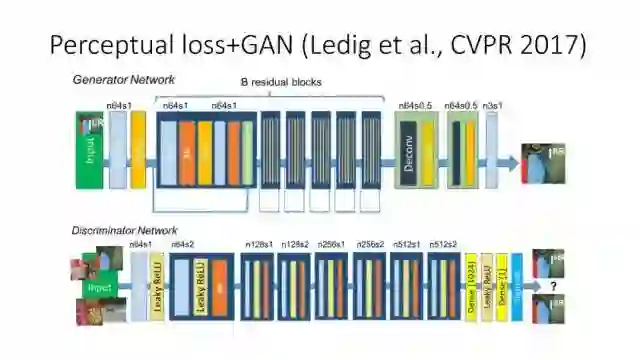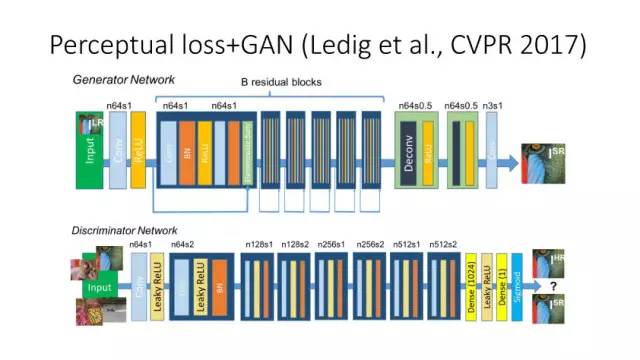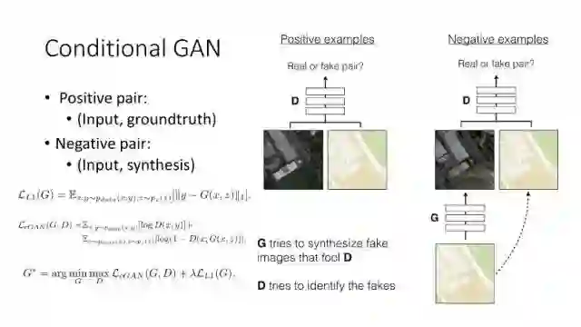 前面提到的基于MSE 定义的loss来实现Image Translation具有一定局限性,它会过于平滑图像,同时还会损失边缘和纹理细节信息。利用深度网络,比如VGG来实现基于perceptual loss的图像转换也会损失边缘和纹理细节信息,还会引入一些人工仿真场景信息。Ledig等人在今年CVPR上发表了文章将Perceptual loss和GAN结合,从而使得转换更为逼真。如果按照前面的这些方法来实现,我们需要设计用什么网络来实现计算Perceptual loss。那么如何避免去显示定义网络来实现Perceptual loss?Conditional GAN就可以实现,它定义正对(输入和真实图像)和反对(输入和仿真图像),然后学习网络来实现正确判断正反对。这样就可以将perceptual 隐式嵌入到网络中,这种conditional GAN方法是当时实现效果最好的。