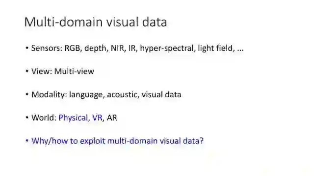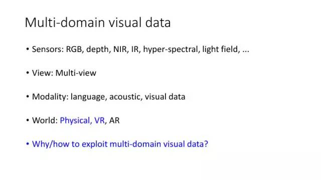 我们首先讨论多领域的视觉数据。对于现在来说,它应该是我们可以用各种不同传感器,比如RGB和深度摄像机、红外、超光谱等来获取的数据。另外一个就是可以从不同视角去拍摄获取。此外,我们可以用语言来描述某个场景或者物体,也可以用声音、视频去记录。同样我们也可以用真实物理世界、VR、AR等方式去重现展示,从而形成视觉数据描述。