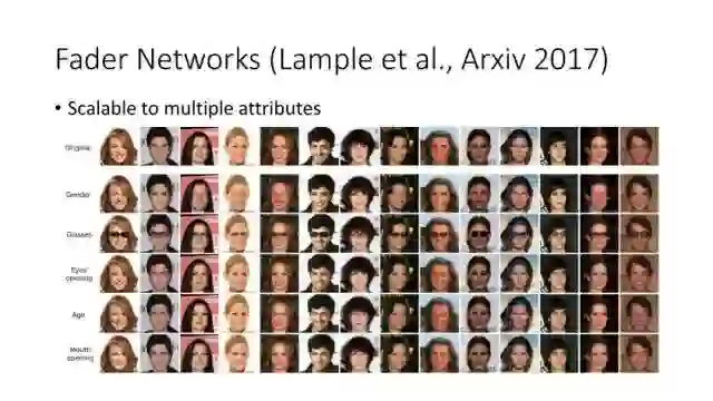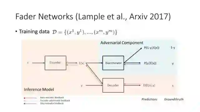 还有Facebook的一个工作,这个比较明确,就是说这里面有一个encoder,最后这个output需要设置什么样就是什么样。同时如果想调整这个Y得到目标的话,需要满足这个E(x)和Y是独立。这样的网络有一个很大好处就是它学一个网络,可以任意改变人脸的一个attribute即可,比如性别、年龄、眼镜等。这种网络结构是一个比较简洁比较漂亮的模型。