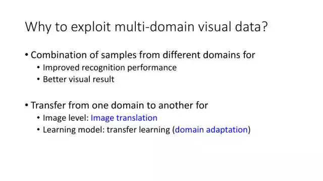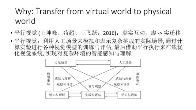 那么我们怎么去利用这些多领域视觉数据来更有效率的去解决问题?第一个就是我们可以把不同领域的数据融合在一起,然后来做一些事情。如果这种融合是在这种学习识别和分类这种融合的话,那么它肯定会对识别和分类的性能会有帮助。此外这种融合可以让它在原始数据基础上得到一些比较好的视觉效果,或者是得到一些就是我们想要的一些视觉特效。例如Suwajanakorn等人在今年Siggraph上的文章实现输入音频和奥巴马图像,输出合成的视频,使得嘴型和音频匹配。另外一个融合可以通过迁移学习实现。今年李开复在一个talk就提出过,深度学习之后是增强学习,然后就是迁移学习。王坤峰等提出的平行视觉也可以从该角度来理解,就相当于说我们先模拟得到一个场景,在这个场景训练一个模型,然后最后再把这个实验的模型在应用到实际,中间再会有一些交互平行执行使得模型优化。