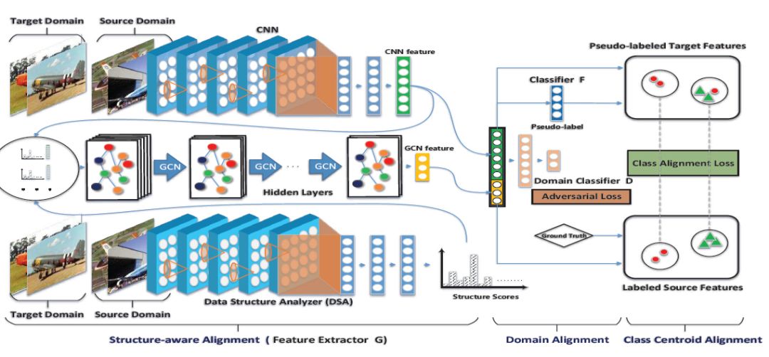 摘要:为了在源域和目标域之间架起桥梁进行域适应,有三种重要的信息类型:数据结构、域标签和类标签。现有的域适应方法大多只利用一种或两种类型的上述信息,不能使它们相互补充和增强。与现有的方法不同,我们提出了一种端到端图卷积对抗网络(GCAN),通过在统一的深度模型中对数据结构、域标签和类标签进行联合建模,实现无监督域自适应。我们提出的GCAN模型有几个优点。首先,据我们所知,这是第一次将这三种信息联合建模到一个用于无监督域自适应的深度模型中。其次,该模型设计了structure-aware alignment、domain alignment和class centroid alignment三种有效的alignment机制,能够有效地学习域不变和语义表示,减少域间的差异,进行域自适应。在五个标准benchmark上的大量实验结果表明,该算法具有良好的性能并且可以对抗目前最先进的无监督域自适应方法。
