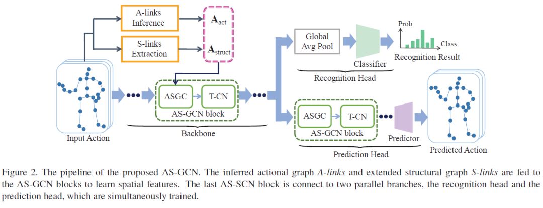 摘要:利用skeleton数据进行动作识别是近年来计算机视觉领域的研究热点。以往的研究大多基于固定的skeleton图,只捕捉关节之间的局部物理依赖关系,可能忽略了关节间的隐式关联。为了捕获更丰富的依赖关系,我们引入了一种称为A-link推理模块的编解码器结构,以直接从动作捕获特定于动作的潜在依赖关系,即动作链接。我们还扩展了现有的skeleton图来表示更高阶的依赖关系,即结构链接。将这两种类型的链接结合成一个广义的skeleton图,进一步提出了Actional-Structural Graph Convolutional Networks (AS-GCN),它将动作结构图卷积和时间卷积作为基本的构建块,学习动作识别的时空特征。在recognition head的基础上,增加了一个future pose prediction head,通过自监督来帮助捕获更详细的动作模式。我们使用两个skeleton数据集,NTURGB+D和Kinetics来验证AS-GCN在动作识别中的有效性。与最先进的方法相比,提出的AS-GCN实现了持续的较大改进。AS-GCN作为一种副产品,在未来的姿势预测中也显示出良好的应用前景。