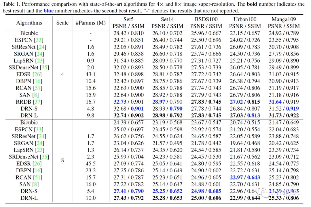 有监督部分和目前大部分模型一样,使用的是常见的Data pair数据集DIV2K和Flick2K作为训练集,测试集为常见的SET5, SET14, BSDS100,URBAN100 和MANGA109。模型设置上,作者设置了两个不同参数量的模型,DRN-S(小模型)和DRN-L(大模型)。