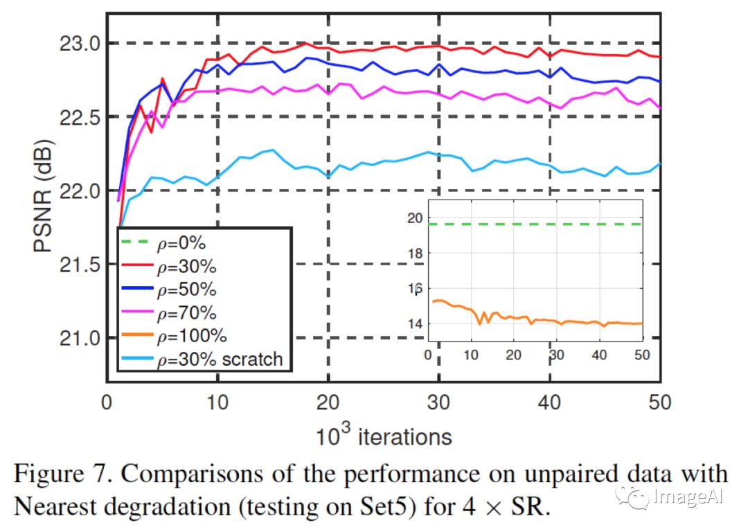 「为了定性的计算PSNR和SSIM:」data unpair则是在ImageNet中随机选取了3K张图像,并对图片使用Nearest和BD两种不同的方式采样出LR图像,将LR用于半监督训练。其结果同样非常不错。