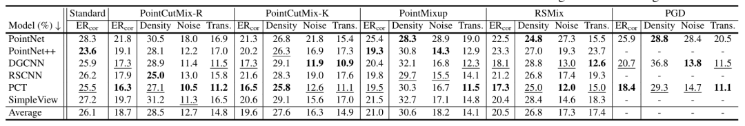 表3. 在标准训练下不同模型在ModelNet40-C上的错误率。