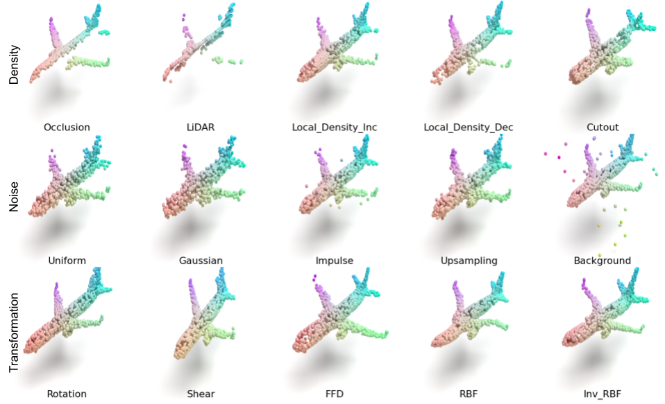ModelNet40-C的失真分为密度 (density) 失真,噪音 (noise) 失真,以及变换 (transformation) 失真三类。