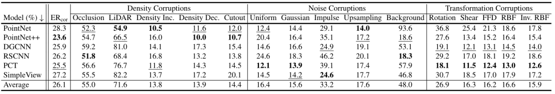 如表1所示,作者在PointNet, PointNet++, DGCNN, RSCNN, PCT, 以及SimpleView 六个模型上进行了基准测试。作者总结了一些发现: