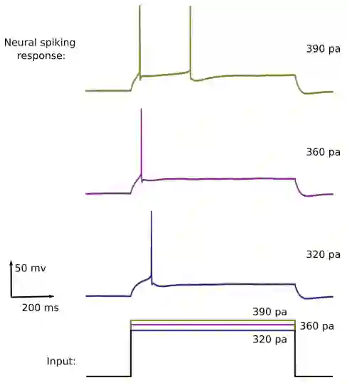 脉冲神经元(Spiking neuron)已经成为开发用于 AI 的全新计算硬件的核心,其有望极大降低能量预算。部分原因是人脑的巨型 SNN(包含约 1000 亿个神经元)的功耗仅为 20 W。脉冲神经元的输出是一系列定型脉冲。因此,它们的输出与 ANN 神经元的输出非常不同,ANN 神经元的输出是连续数值。大多数脉冲神经元模型都可视为神经形态硬件的实现,它们的设计灵感都来自大脑脉冲神经元的简单模型。但是,这些简单的神经元模型不同于生物神经元,并不具备通过不同的时间脉冲模式来编码不同输入的能力——只靠发射率是不行的(下图 1 给出了一个示例)。