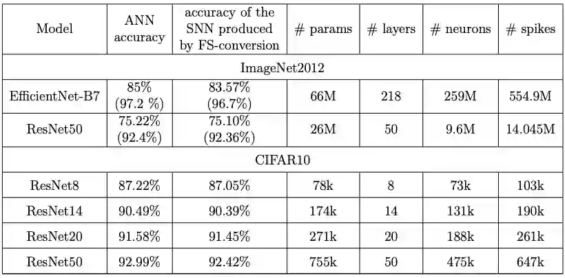 表 1:对两个当前最佳的 CNN 使用 FS 转换,基于 ImageNet 分类图像的准确度和脉冲数量。通过 FS 转换而得到的 SNN 几乎实现了与对应 ANN 一样的准确度,而且每个神经元通常最多使用 2 个脉冲。括号中的数据是 Top5 准确度。推理所需的脉冲数量数据是在 1000 张测试图像上得到的平均值。