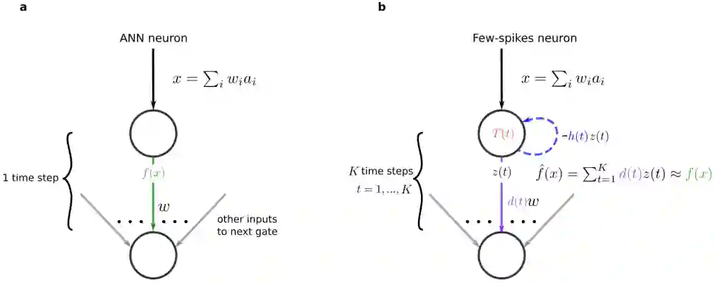 图 2:ANN 神经元到 FS 神经元的转换。a)一个激活函数为 f(x) 的一般 ANN 神经元;b)用 K 个时间步骤仿真这个 ANN 神经元的 FS 神经元,其输出序列表示为 z(t)。