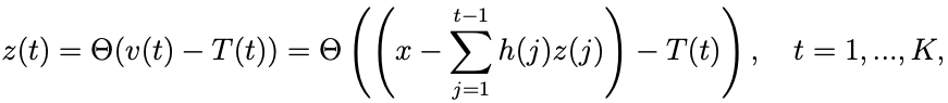 研究者假设膜电位 v(t) 不漏电,但在时间 t 的脉冲之后会被重置为 v(t)−h(t)。用公式表示的话,膜电位 v(t) 的初始值为 v(1)=x,其中 x 是门的输入,然后基于以下公式在 K 个步骤中不断演变: