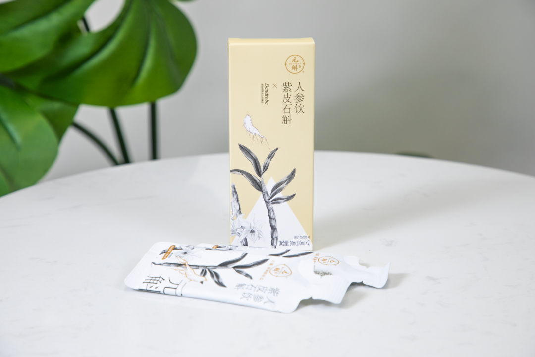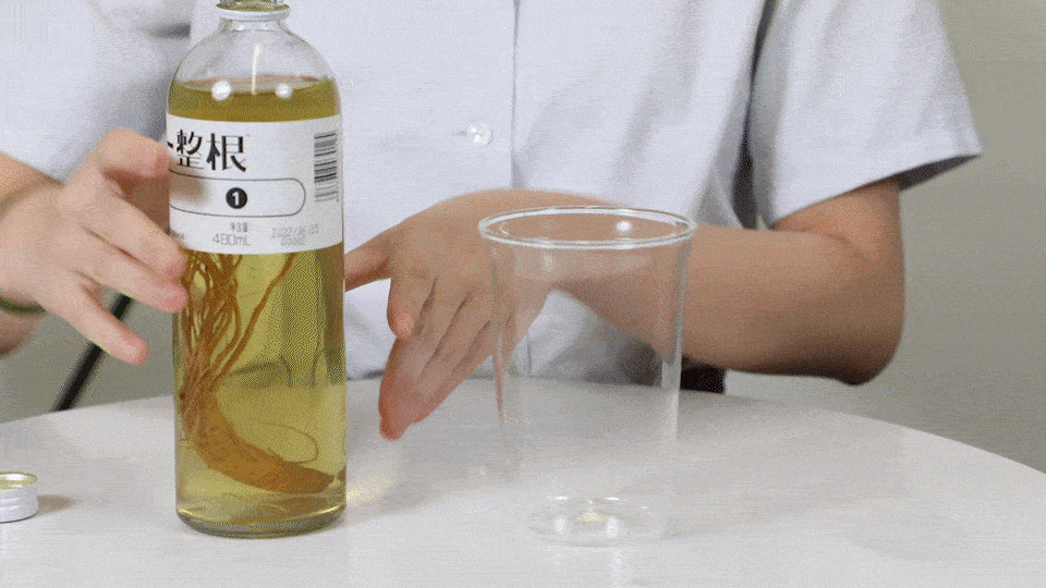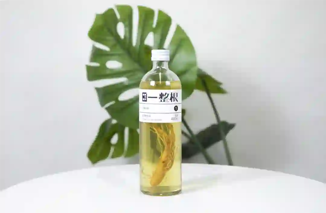 这个一整根人参水,看起来确实非常高贵,非常唬人,极简钟型玻璃瓶包装,铝盖封口,搭配这个黑白极简风的标签,感觉喝一口不是要成仙就是要接受996的福报。