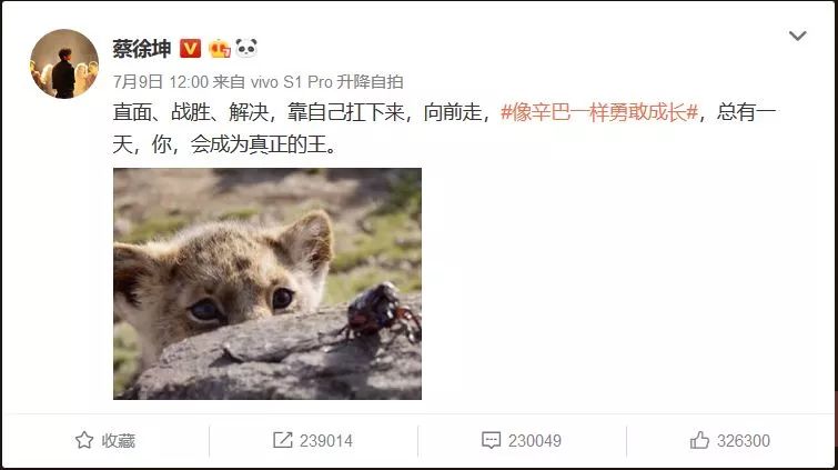 在像#辛巴一样勇敢成长#的微博话题中,片方分别邀请了蔡徐坤、李易峰、罗志祥等当红明星,分享他们与狮子王“辛巴”的成长故事。