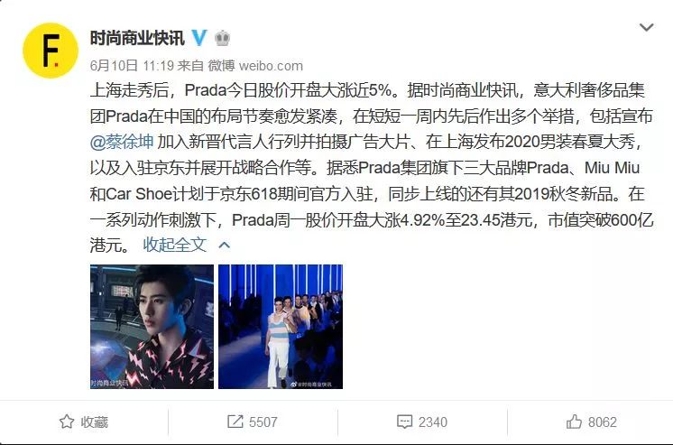 据微博用户@圈内教父统计,蔡徐坤代言奢侈品品牌Prada“官宣”后,首周Prada集团股价开盘大涨近5%;代言vivo“官宣”后,第二个月品牌实现突破首度夺得中国畅销手机品牌榜首;代言李维斯之后,品牌第一季度同比扭亏为盈,收入较去年增长了11%;代言国民品牌汤臣倍健新线yep系列去年双十一首日单线预订600万,是去年整体的837%。