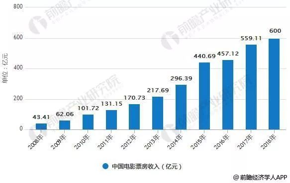 根据前瞻产业研究院发布的《电影产业市场前瞻与投资战略规划分析报告》数据统计,2008年到2018年,中国电影总票房从43.41亿涨至600亿元,是十年前的约13倍,并成为仅次于美国的全球第二大电影票仓。