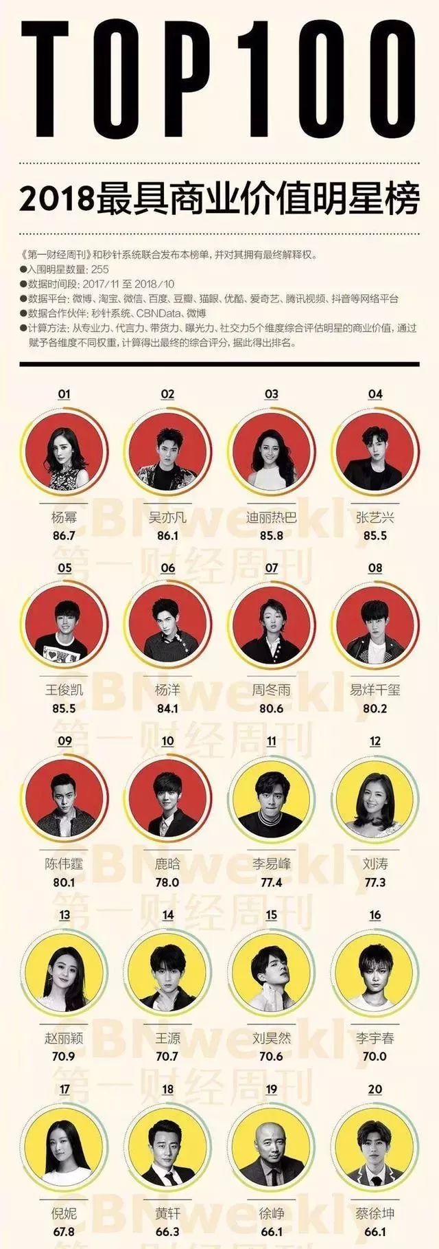 在《第一财经周刊》发布的《2018最具商业价值明星榜》中,杨幂、吴亦凡、迪丽热巴、张艺兴、王俊凯位列前五,前十位全部由“流量明星”占领。这是由明星的专业力、代言力、带货力、曝光力、社交力五个维度综合评估出的结果。