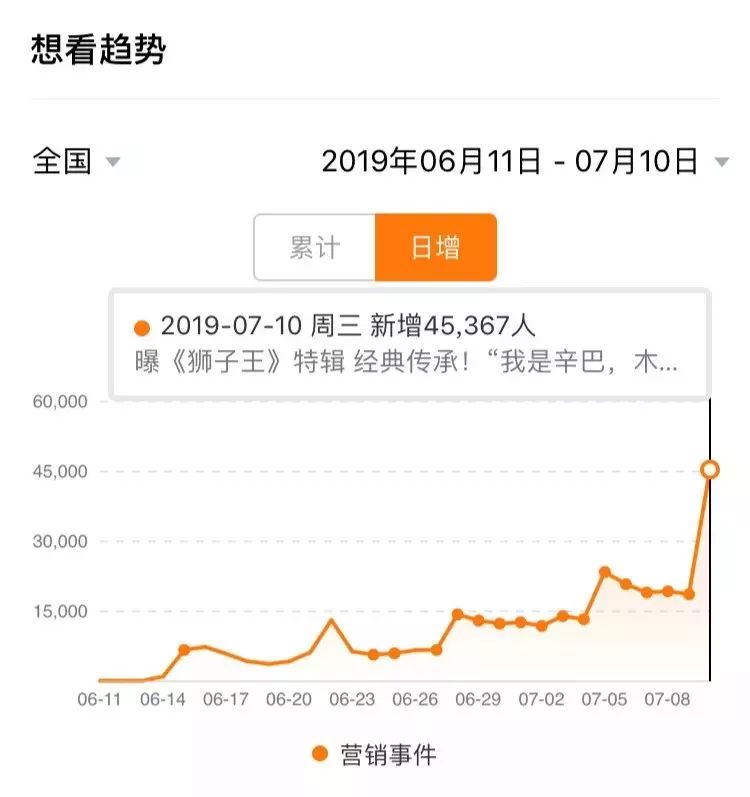 灯塔专业版数据显示,《狮子王》的想看人数,也在7月9日到7月10日之间经历了大幅度增长。