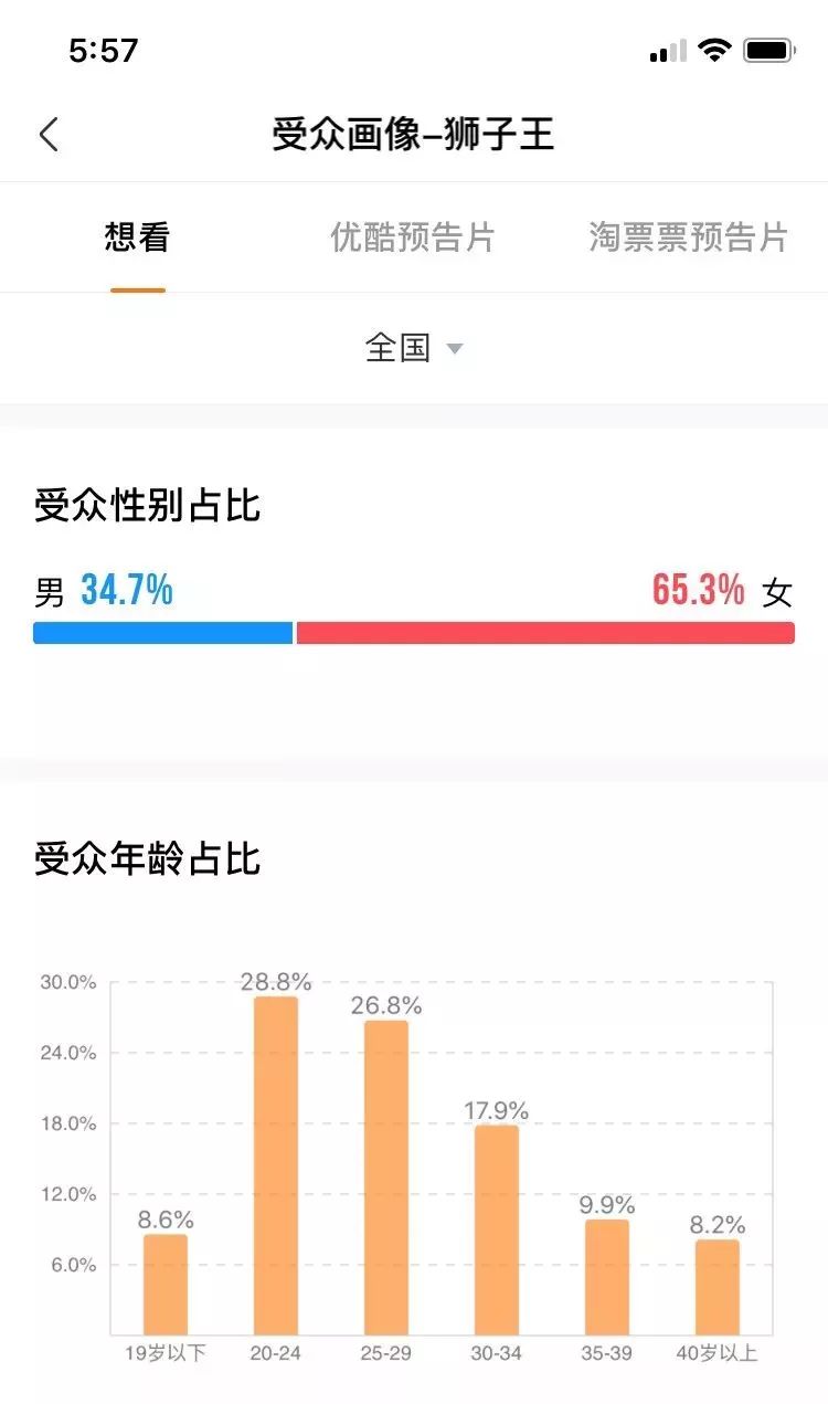 再从《狮子王》的受众来看,在灯塔专业版的想看受众画像中,女性观众占比65.3%,高于男性观众的34.7%;20-24岁的观众占比最高,达到了28.8%。