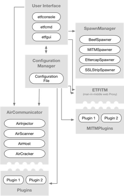 ETF 支持多种与框架交互的用户界面,当前的默认界面是一个交互式控制台界面,类似于 Metasploit[4] 那种。正在开发用于桌面/浏览器使用的图形用户界面(GUI)和命令行界面(CLI),移动端界面也是未来的一个备选项。用户可以使用交互式控制台界面来修改配置文件里的设置(最终会使用 GUI)。用户界面可以与存在于这个框架里的每个模块进行交互。